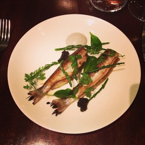 En av kvällens förrätter: spishalstrad siklöja med störkaviar & ostronört 165pix. Grymt gott