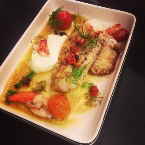 Smörstekt gös med hummer, blomkålspuré och skaldjursvinaigrette.