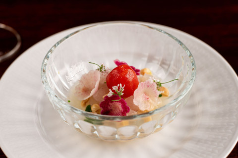 Crudo på regnbågslax med äppelponzu, pepparrot, salvia och saltad trädgårdsgurka 215